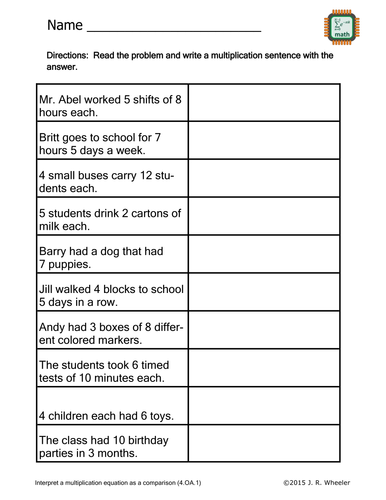 Multiplication As Comparison Problems Worksheet 4 Oa 1