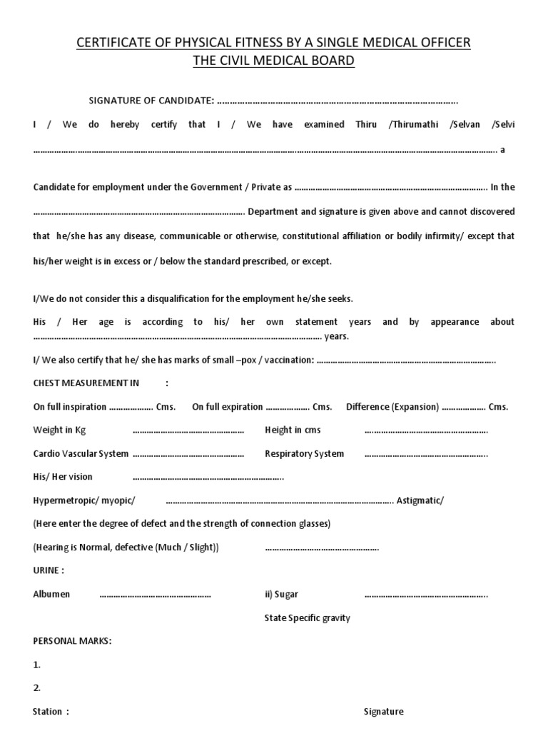 Certificate Of Physical Fitness By A Single Medical Officer