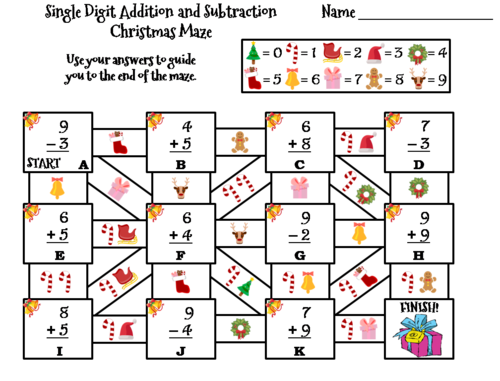 Single Digit Addition And Subtraction Christmas Math Maze