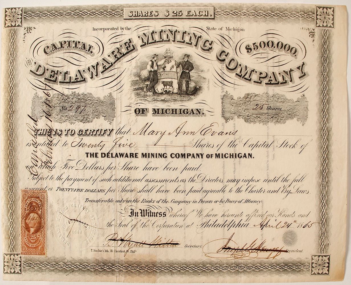 Delaware Mining Co Of Michigan Stock Certificate 1865