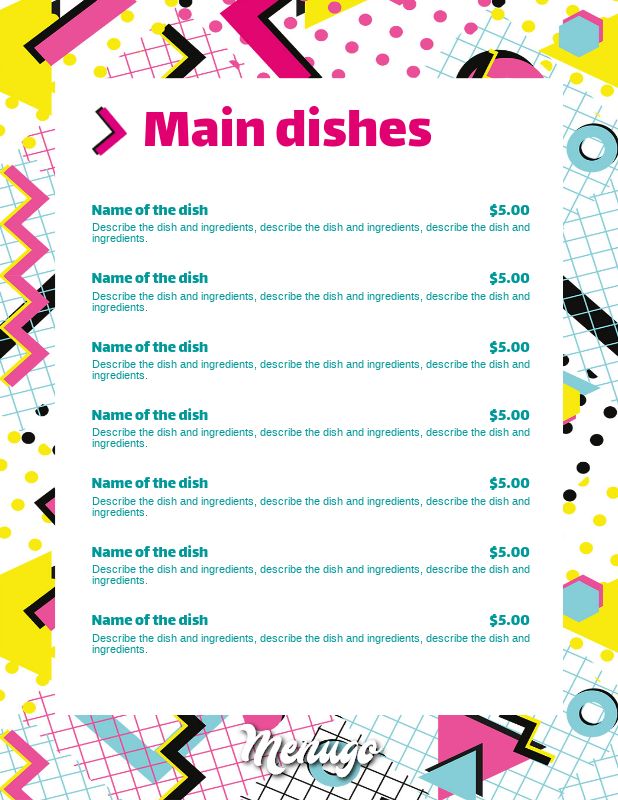 Fun menu template. We have a variety of beautiful menu templates to choose from to help get you started. Choose a menu template that defines your restaurant brand sells more of your items and increases customer loyalty. All are sure to be a feast to your customers eyes. Tempt patrons with your yummy offerings using custom menus you create yourself in minutes.