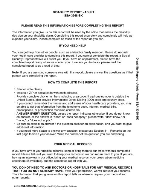 Check x whether you are female. Do not write in this space 1. Disability report adult form ssa 3368 bk please read all of this information before you begin completing this form tills is not an application if you need help if you need help with this form do as much of it as you can and your interviewer will help you finish it. Work history report form ssa 3369 bk read all of this information before you begin completing this form if you need help if you need help with this form complete as much of it as you can.